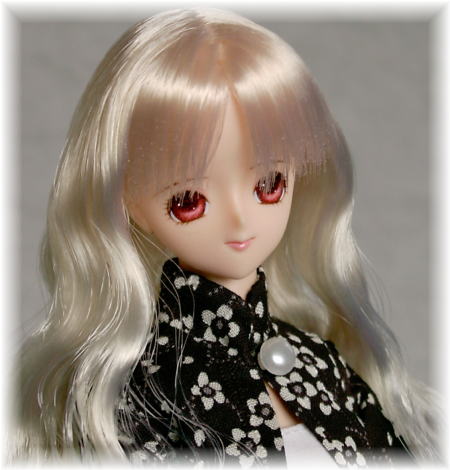 赤目ちゃんは、つい白い髪と合わせたくなります。 白うさぎのイメージ? この子の髪は、真っ白ではなく、ちょっと黄味がかってますが。 ふんわりウエーブの髪型と、優しげな表情の雰囲気の合った、 可愛い子に仕上がったと思います。