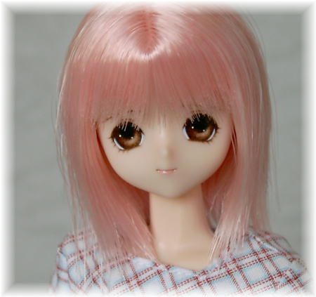 ピンク髪のミニちゃんです。 このピンク髪、濃い目の派手なピンク色なので、 瞳の色や髪型をどうしよう〜と悩んで、 こんなところに落ち着きました。 派手に見えないようにするために、 瞳を地味な茶色にして、 髪は、シャギー入りのセミロングにカットしました。 大人びた表情のミニちゃんになりました。