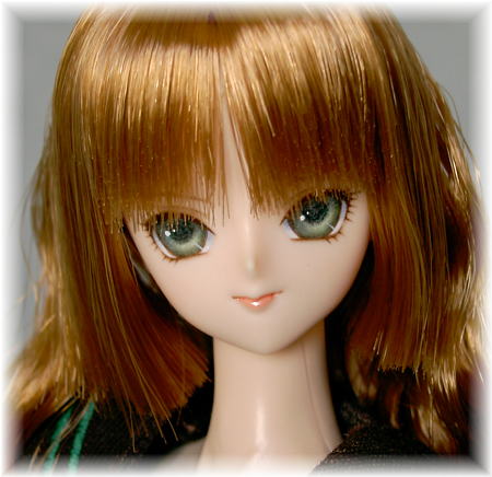 オビツヘッドの、華やかなツリ目ちゃんです。 個人的に、かなり好きな顔に出来上がりました。 髪型は、サイドの髪をあごより長めくらいで切りそろえ、 後ろ髪はソバージュにしています。