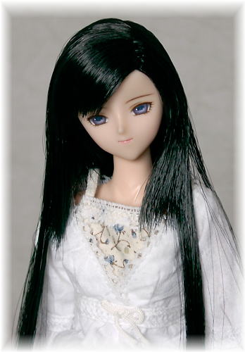 大人っぽい感じの子を、と思って作りました。 ちょっとツリ目で、微笑んでいるような表情の子です。 髪型は、サイドの髪を肩くらいでシャギーカットして、 後ろ髪はまっすぐに切りそろえています。