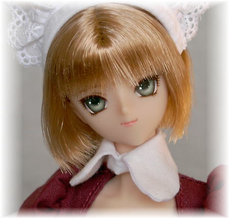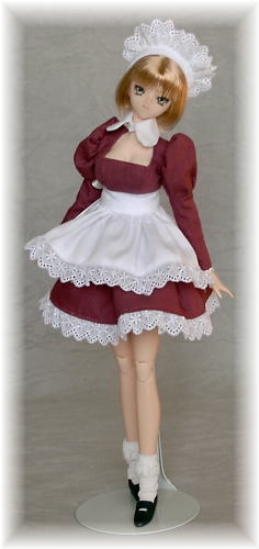フルセットのお嬢さんです。 弱気な表情のツリ目ちゃんです。 髪型は、軽く内巻きになったショートボブです。 髪の丸みが可愛いです。 衣装は、ミニメイドの赤紫です。 ドレスのセット内容は、 ワンピース、エプロン、カチューシャ、ソックス、ショーツ、靴(ボークス製・プラスチック) 以上6点です。