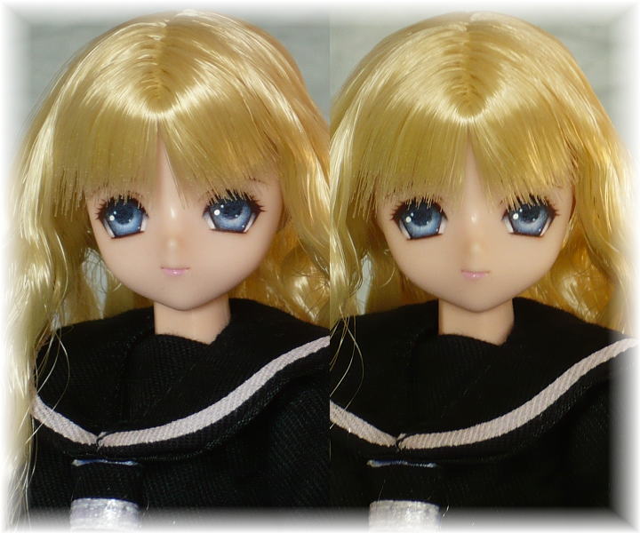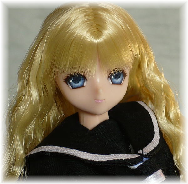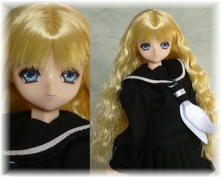 ブルーアイのミニちゃんです。 リップはピンクです。 王道?の金髪+ブルーアイの組み合わせです。 髪型は、ふわふわのソバージュにしました。 ヒップくらいの長さで、カットしています。 モデルさんの衣装は、アゾンの23用セーラー服です。 似合わないかな〜?と思いつつ着せてみましたが、 以外に似合ってます。 金髪に制服も、アリですね。
