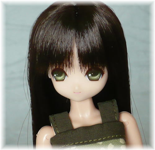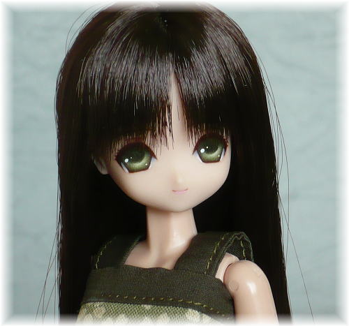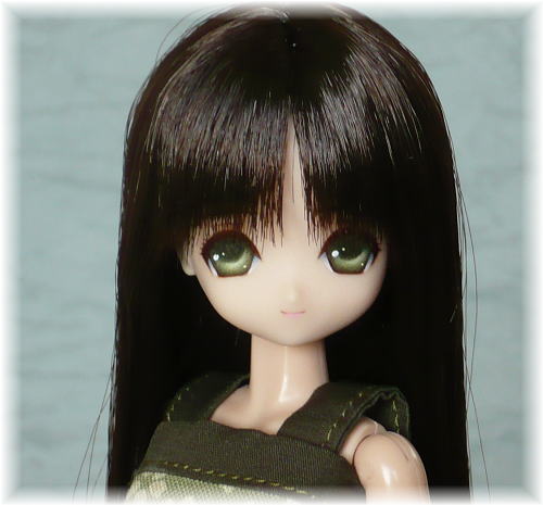 オビツ21-02ヘッドの子です。 素朴な表情のロリちゃんになりました。 瞳はグリーン、リップはピンクのラインを入れています。 髪型は、ストレートです。 毛先を真っ直ぐに切りそろえています。 モデルさんの衣装は、自作です。 変わり栄えしない衣装ですが、瞳と同じ色で似合っています。