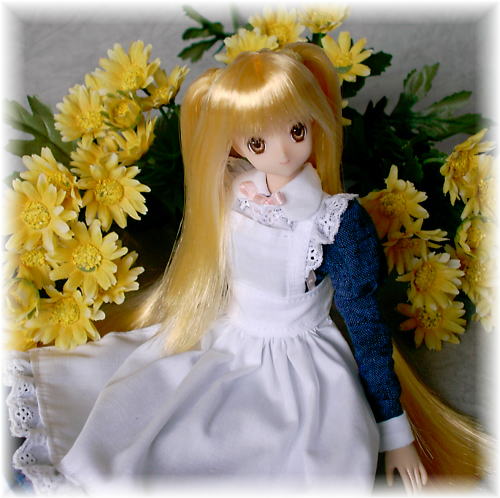 カウプレ用に作りました、黄色髪のミディちゃんです。 瞳の色は、茶色にしてみました。 リップは、ナチュラルなベージュ系です。 チークは今回は入れていません。 黄色いお花と一緒に撮ってみました。 さわやかなかんじです。