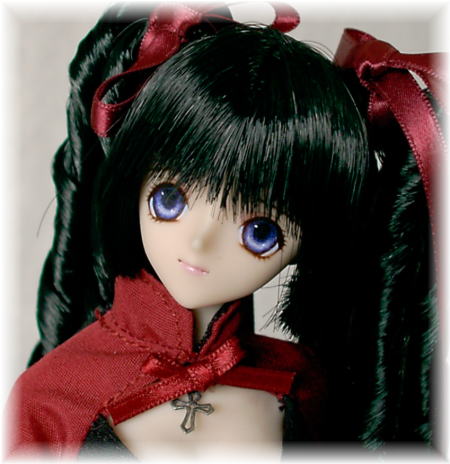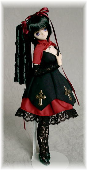 ドレスは、暗赤と黒の2色使いのワンピースに、