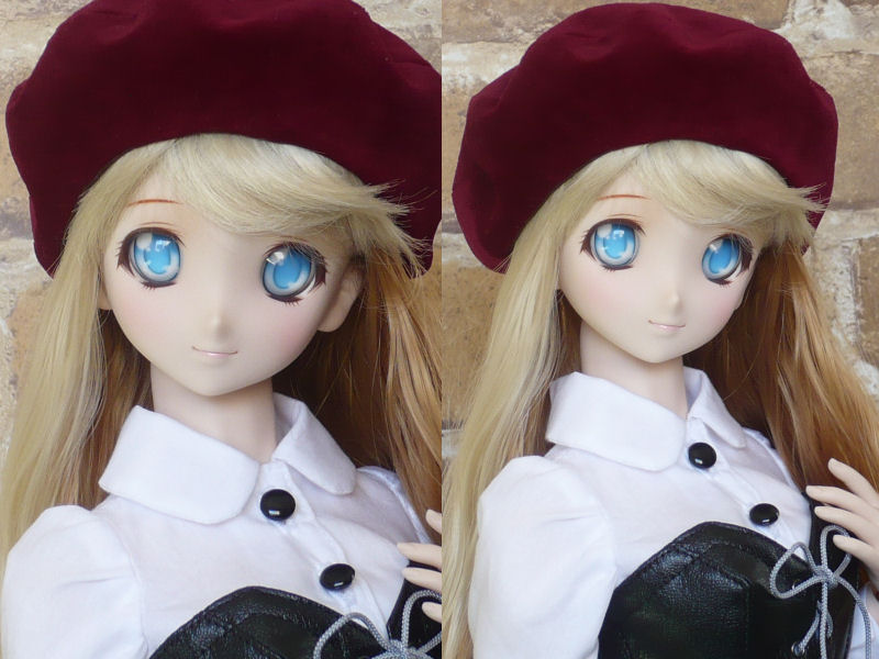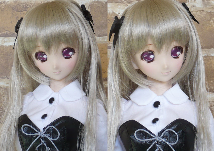 ショップ販売用に作った子です。 削りはしていません。 アイは2組です。 (1)ボークスアニメティックアイズ Iタイプ 24mm るり (2)個人ディーラー製レジンアイ 赤紫系