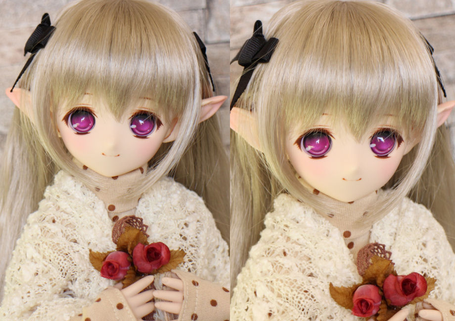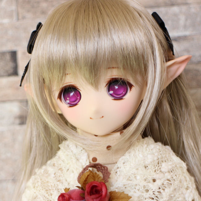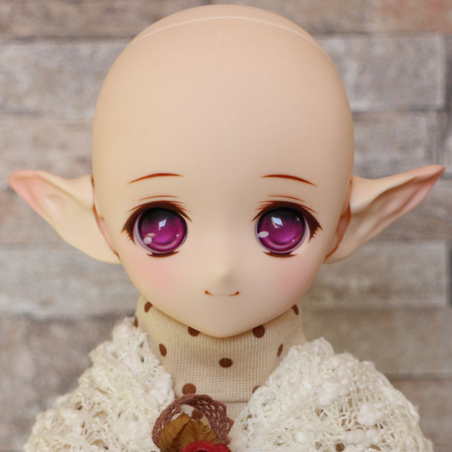 ショップ販売用に作った子です。開眼カスタムし、口モールドを削って消しています。妖精耳つきです。 アイは1組付きます。 PARABOXアニメアイ 20mm A パープル