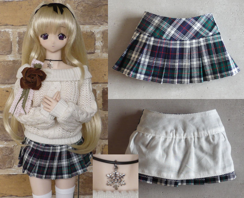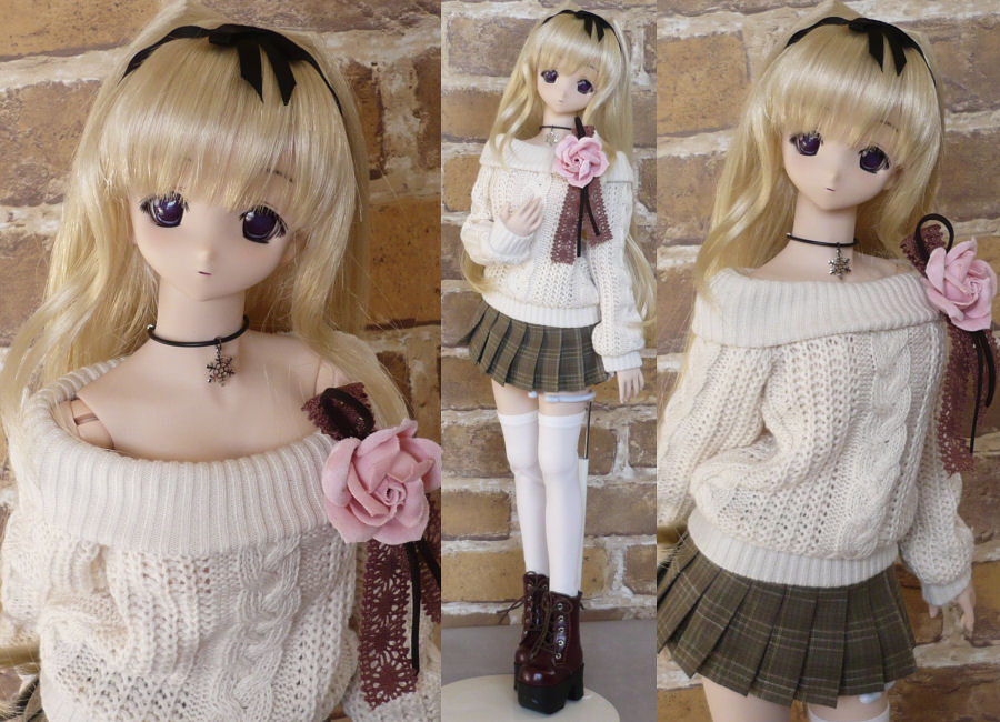 セーター、スカート、ソックス、チョーカー、コサージュ。
