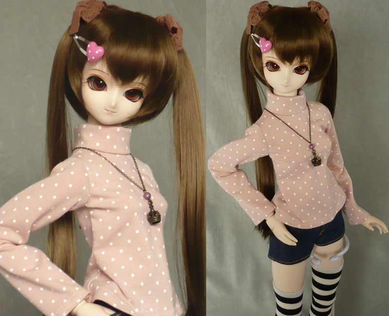 タートルネックカットソーは、ピンクの水玉のニット地で作りました。