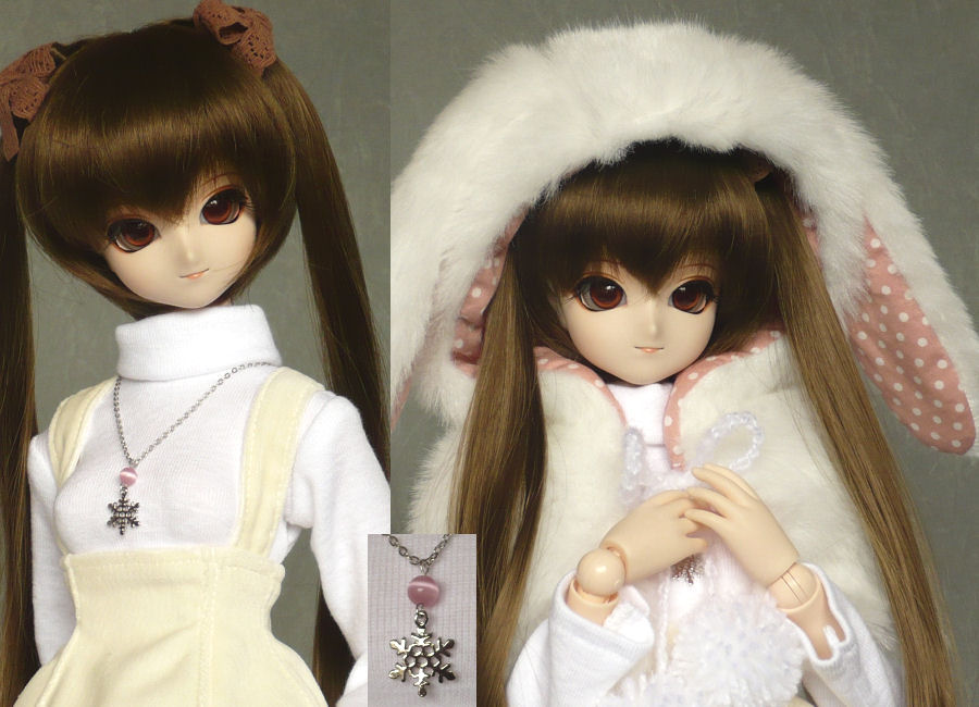 ネックレスは雪の結晶型チャームと、ピンクの人工キャッツアイを使いました。