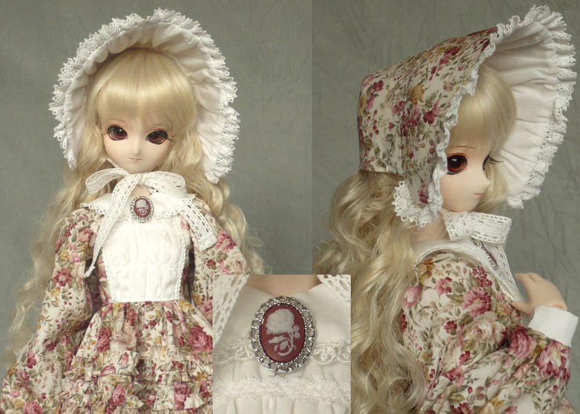 ワンピース、ボンネット、ストッキング、ブローチ。