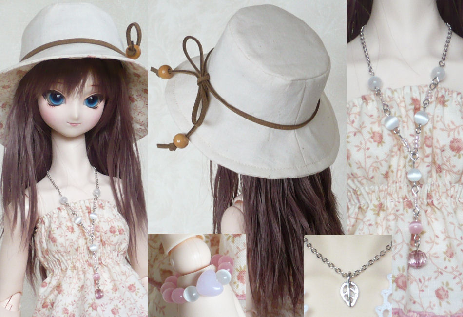 ベアトップワンピース、レギンス、帽子、ボレロ、ネックレス(2種)、ブレスレット。